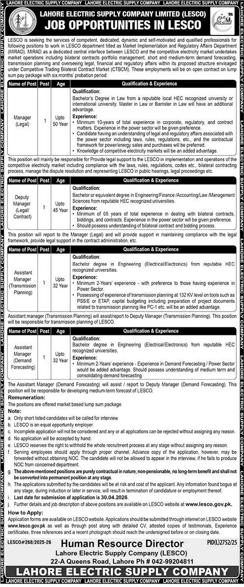 Lahore Electric Supply Company Limited (LESCO) has announced new job opportunities for April, 2026. The company is looking for qualified, experienced, and motivated professionals to join its team on a contract basis. These jobs are offered under a World Bank-funded project to improve the electricity distribution system.