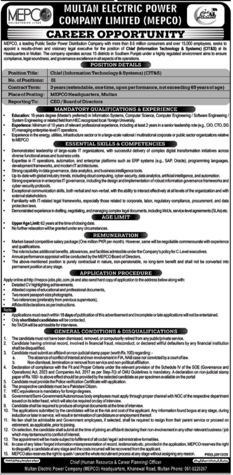 MEPCO Jobs 2026 — Multan Electric Power Company Limited (MEPCO) has announced a major career opportunity for qualified professionals. MEPCO is one of Pakistan’s largest public sector power distribution companies, serving over 8.6 million consumers across 15 districts in Southern Punjab with a workforce of more than 15,000 employees. The company is hiring a senior C-Level IT executive for its Headquarters in Multan.