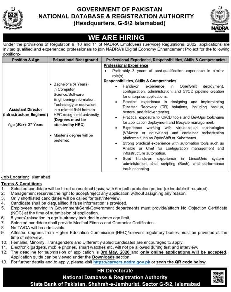 The National Database and Registration Authority (NADRA) is hiring skilled professionals for its Digital Economy Enhancement Project. In this post, you will find simple details about the job, required education, and how to apply. The last date to apply for this job is 03 May, 2026.