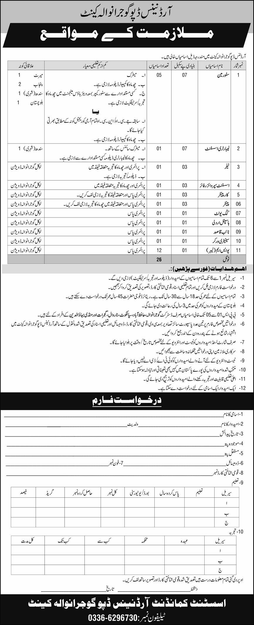 The following posts are announced in Pakistan Army (Ordnance Depot) at Gujranwala: