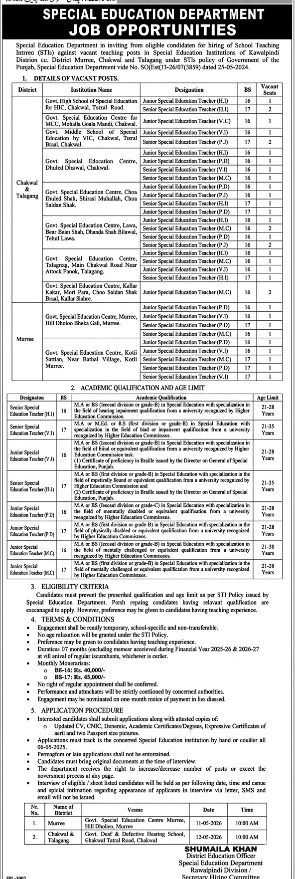 Candidates must meet the qualification and age criteria defined under the STI policy of the Special Education Department. Their academic qualification should align with the relevant specialization, including Hearing Impairment (H.I), Visual Impairment (V.I), Physically Disabled (P.D), or Mentally Challenged (M.C).