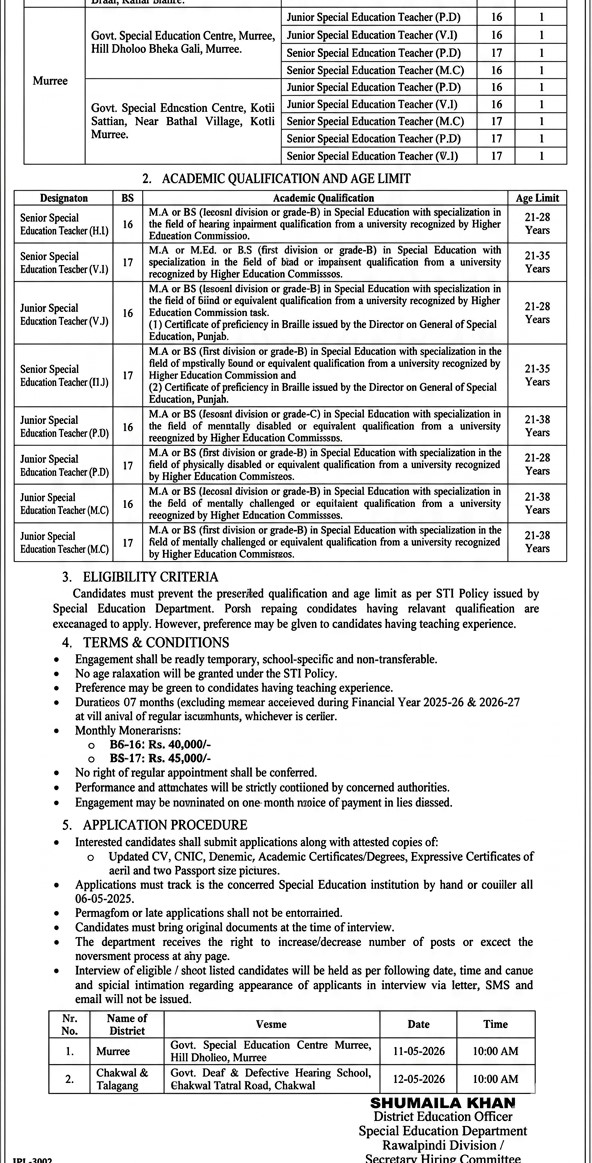 The Special Education Department, Government of Punjab has announced new School Teaching Interns (STIs) Jobs 2026 in District Murree. Both male, female, and transgender candidates can apply for these temporary teaching positions in special education institutions. These jobs are temporary but offer good salary and valuable teaching experience.