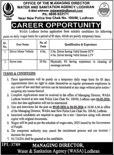 The Water and Sanitation Agency (WASA) Lodhran has announced new job opportunities for candidates looking for temporary government work. These jobs are offered on a daily wages basis for a period of 85 days. If you are physically fit and meet the requirements, this is a good chance to gain experience in a government department.